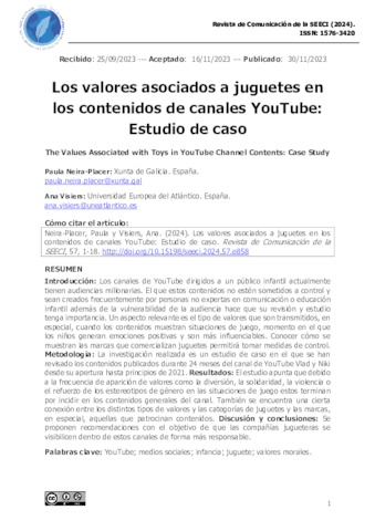 Neira-Placer, Paula and Visiers, Ana UNSPECIFIED, ana.visiers@uneatlantico.es (2023) Los valores asociados a juguetes en los contenidos de canales YouTube: Estudio de caso. Revista de Comunicación de la SEECI, 57. pp. 1-19. ISSN 2695-5156