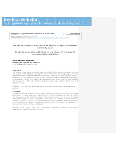 Sánchez-Bejerano, Lucía lucia.sanchez@uneatlantico.es (2023) The use of authentic materials in an English for Specific Purposes university class. Revista Nebrija de Lingüística Aplicada a la Enseñanza de Lenguas, 17 (35).