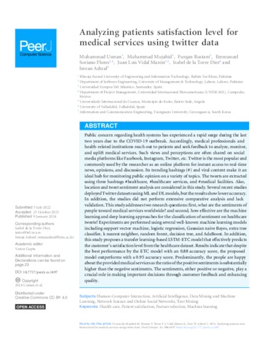 Usman, Muhammad and Mujahid, Muhammad and Rustam, Furqan and Soriano Flores, Emmanuel and Vidal Mazón, Juan Luis and Díez, Isabel de la Torre and Ashraf, Imran UNSPECIFIED, UNSPECIFIED, UNSPECIFIED, emmanuel.soriano@uneatlantico.es, juanluis.vidal@uneatlantico.es, UNSPECIFIED, UNSPECIFIED (2024) Analyzing patients satisfaction level for medical services using twitter data. PeerJ Computer Science, 10. e1697. ISSN 2376-5992