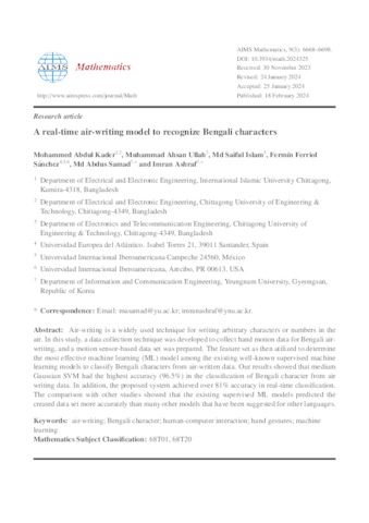 Kader, Mohammed Abdul and Ullah, Muhammad Ahsan and Islam, Md Saiful and Ferriol Sánchez, Fermín and Samad, Md Abdus and Ashraf, Imran UNSPECIFIED, UNSPECIFIED, UNSPECIFIED, fermin.ferriol@unini.edu.mx, UNSPECIFIED, UNSPECIFIED (2024) A real-time air-writing model to recognize Bengali characters. AIMS Mathematics, 9 (3). pp. 6668-6698. ISSN 2473-6988
