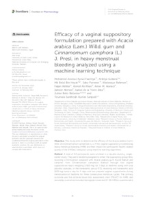 Fazmiya, Mohamed Joonus Aynul and Sultana, Arshiya and Heyat, Md Belal Bin and Parveen, Saba and Rahman, Khaleequr and Akhtar, Faijan and Khan, Azmat Ali and Alanazi, Amer M. and Ahmed, Zaheer and Díez, Isabel de la Torre and Brito Ballester, Julién and Saripalli, Tirumala Santhosh Kumar UNSPECIFIED, UNSPECIFIED, UNSPECIFIED, UNSPECIFIED, UNSPECIFIED, UNSPECIFIED, UNSPECIFIED, UNSPECIFIED, UNSPECIFIED, UNSPECIFIED, julien.brito@uneatlantico.es, UNSPECIFIED (2024) Efficacy of a vaginal suppository formulation prepared with Acacia arabica (Lam.) Willd. gum and Cinnamomum camphora (L.) J. Presl. in heavy menstrual bleeding analyzed using a machine learning technique. Frontiers in Pharmacology, 15. ISSN 1663-9812