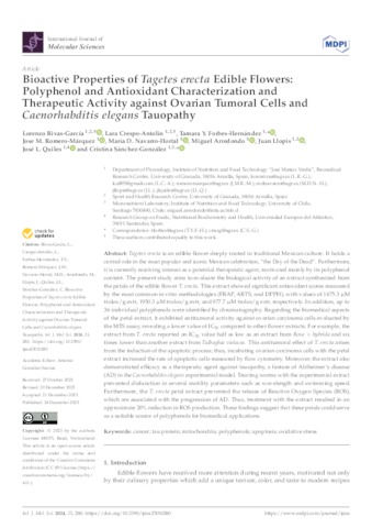 Rivas-García, Lorenzo and Crespo-Antolín, Lara and Forbes-Hernández, Tamara Y. and Romero-Márquez, Jose M. and Navarro-Hortal, María D. and Arredondo, Miguel and Llopis, Juan and Quiles, José L. and Sánchez-González, Cristina UNSPECIFIED, UNSPECIFIED, UNSPECIFIED, UNSPECIFIED, UNSPECIFIED, UNSPECIFIED, UNSPECIFIED, jose.quiles@uneatlantico.es, UNSPECIFIED (2023) Bioactive Properties of Tagetes erecta Edible Flowers: Polyphenol and Antioxidant Characterization and Therapeutic Activity against Ovarian Tumoral Cells and Caenorhabditis elegans Tauopathy. International Journal of Molecular Sciences, 25 (1). p. 280. ISSN 1422-0067