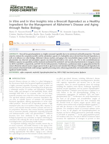 Navarro-Hortal, María D. and Romero-Márquez, Jose M. and López-Bascón, M. Asunción and Sánchez-González, Cristina and Xiao, Jianbo and Sumalla Cano, Sandra and Battino, Maurizio and Forbes-Hernande, Tamara Y. and Quiles, José L. UNSPECIFIED, UNSPECIFIED, UNSPECIFIED, UNSPECIFIED, UNSPECIFIED, sandra.sumalla@uneatlantico.es, maurizio.battino@uneatlantico.es, tamara.forbes@unini.edu.mx, jose.quiles@uneatlantico.es (2024) In Vitro and In Vivo Insights into a Broccoli Byproduct as a Healthy Ingredient for the Management of Alzheimer’s Disease and Aging through Redox Biology. Journal of Agricultural and Food Chemistry, 72 (10). pp. 5197-5211. ISSN 0021-8561
