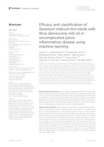 Sumbul, X. and Sultana, Arshiya and Heyat, Md Belal Bin and Rahman, Khaleequr and Akhtar, Faijan and Parveen, Saba and Briones Urbano, Mercedes and Lipari, Vivian and De la Torre Díez, Isabel and Khan, Azmat Ali and Malik, Abdul UNSPECIFIED, UNSPECIFIED, UNSPECIFIED, UNSPECIFIED, UNSPECIFIED, UNSPECIFIED, mercedes.briones@uneatlantico.es, vivian.lipari@uneatlantico.es, UNSPECIFIED, UNSPECIFIED, UNSPECIFIED (2024) Efficacy and classification of Sesamum indicum linn seeds with Rosa damascena mill oil in uncomplicated pelvic inflammatory disease using machine learning. Frontiers in Chemistry, 12. ISSN 2296-2646