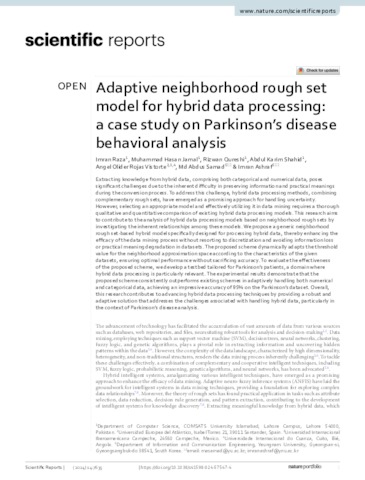 Raza, Imran and Jamal, Muhammad Hasan and Qureshi, Rizwan and Shahid, Abdul Karim and Rojas Vistorte, Angel Olider and Samad, Md Abdus and Ashraf, Imran UNSPECIFIED, UNSPECIFIED, UNSPECIFIED, UNSPECIFIED, angel.rojas@uneatlantico.es, UNSPECIFIED, UNSPECIFIED (2024) Adaptive neighborhood rough set model for hybrid data processing: a case study on Parkinson’s disease behavioral analysis. Scientific Reports, 14 (1). ISSN 2045-2322