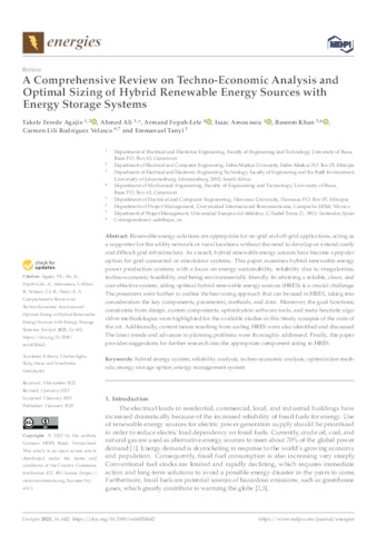 Agajie, Takele Ferede and Ali, Ahmed and Fopah-Lele, Armand and Amoussou, Isaac and Khan, Baseem and Rodríguez Velasco, Carmen Lilí and Tanyi, Emmanuel UNSPECIFIED, UNSPECIFIED, UNSPECIFIED, UNSPECIFIED, UNSPECIFIED, carmen.rodriguez@uneatlantico.es, UNSPECIFIED (2023) A Comprehensive Review on Techno-Economic Analysis and Optimal Sizing of Hybrid Renewable Energy Sources with Energy Storage Systems. Energies, 16 (2). p. 642. ISSN 1996-1073