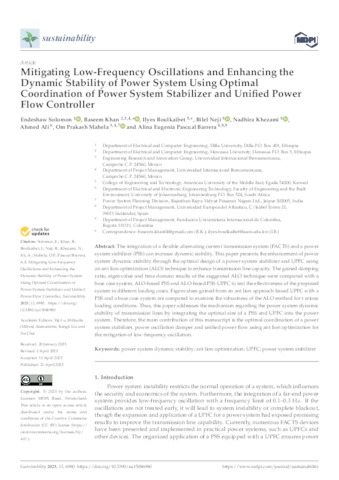 Solomon, Endeshaw and Khan, Baseem and Boulkaibet, Ilyes and Neji, Bilel and Khezami, Nadhira and Ali, Ahmed and Mahela, Om Prakash and Pascual Barrera, Alina Eugenia UNSPECIFIED, UNSPECIFIED, UNSPECIFIED, UNSPECIFIED, UNSPECIFIED, UNSPECIFIED, UNSPECIFIED, alina.pascual@unini.edu.mx (2023) Mitigating Low-Frequency Oscillations and Enhancing the Dynamic Stability of Power System Using Optimal Coordination of Power System Stabilizer and Unified Power Flow Controller. Sustainability, 15 (8). p. 6980. ISSN 2071-1050