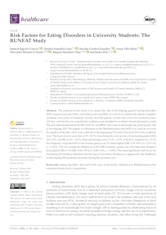 Eguren García, Imanol and Sumalla Cano, Sandra and Conde González, Sandra and Vila-Martí, Anna and Briones Urbano, Mercedes and Martínez Díaz, Raquel and Elío Pascual, Iñaki imanol.eguren@uneatlantico.es, sandra.sumalla@uneatlantico.es, UNSPECIFIED, UNSPECIFIED, mercedes.briones@uneatlantico.es, raquel.martinez@uneatlantico.es, inaki.elio@uneatlantico.es (2024) Risk Factors for Eating Disorders in University Students: The RUNEAT Study. Healthcare, 12 (9). p. 942. ISSN 2227-9032