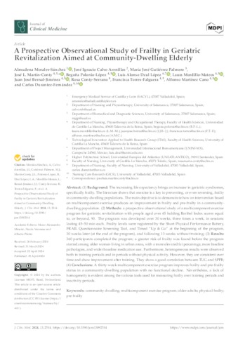 Morales-Sánchez, Almudena and Calvo Arenillas, José Ignacio and Gutiérrez Palmero, María José and Martín-Conty, José L. and Polonio-López, Begoña and Dzul Lopez, Luis Alonso and Mordillo-Mateos, Laura and Bernal-Jiménez, Juan José and Conty-Serrano, Rosa and Torres-Falguera, Francisca and Martínez Cano, Alfonso and Durantez-Fernández, Carlos UNSPECIFIED, UNSPECIFIED, UNSPECIFIED, UNSPECIFIED, UNSPECIFIED, luis.dzul@unini.edu.mx, UNSPECIFIED, UNSPECIFIED, UNSPECIFIED, UNSPECIFIED, UNSPECIFIED, UNSPECIFIED (2024) A Prospective Observational Study of Frailty in Geriatric Revitalization Aimed at Community-Dwelling Elderly. Journal of Clinical Medicine, 13 (9). p. 2514. ISSN 2077-0383