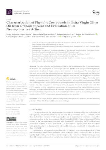 López-Bascón, María Asunción and Moscoso-Ruiz, Inmaculada and Quirantes-Piné, Rosa and del Pino-García, Raquel and López-Gámez, Gloria and Justicia-Rueda, Andrea and Verardo, Vito and Quiles, José L. UNSPECIFIED, UNSPECIFIED, UNSPECIFIED, UNSPECIFIED, UNSPECIFIED, UNSPECIFIED, UNSPECIFIED, jose.quiles@uneatlantico.es (2024) Characterization of Phenolic Compounds in Extra Virgin Olive Oil from Granada (Spain) and Evaluation of Its Neuroprotective Action. International Journal of Molecular Sciences, 25 (9). p. 4878. ISSN 1422-0067
