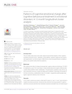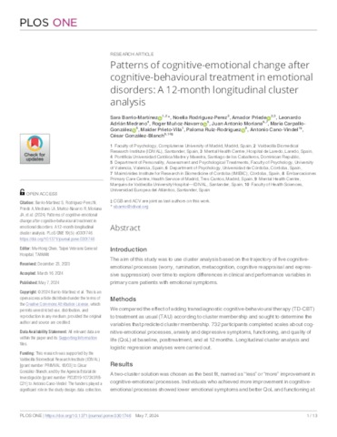 Chen, Mu-Hong and Barrio-Martínez, Sara and Rodriguez-Perez, Noelia and Priede, Amador and Medrano, Leonardo Adrián and Muñoz-Navarro, Roger and Moriana, Juan Antonio and Carpallo-González, María and Prieto-Vila, Maider and Ruiz-Rodríguez, Paloma and Cano-Vindel, Antonio and González-Blanch, César UNSPECIFIED, UNSPECIFIED, UNSPECIFIED, UNSPECIFIED, UNSPECIFIED, UNSPECIFIED, UNSPECIFIED, UNSPECIFIED, UNSPECIFIED, UNSPECIFIED, UNSPECIFIED, cesar.gonzalezblanch@uneatlantico.es (2024) Patterns of cognitive-emotional change after cognitive-behavioural treatment in emotional disorders: A 12-month longitudinal cluster analysis. PLOS ONE, 19 (5). e0301746. ISSN 1932-6203
