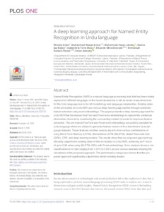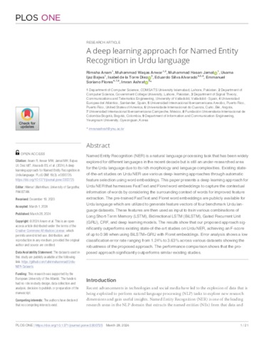 Khan, Hikmat Ullah and Anam, Rimsha and Anwar, Muhammad Waqas and Jamal, Muhammad Hasan and Bajwa, Usama Ijaz and Diez, Isabel de la Torre and Silva Alvarado, Eduardo René and Soriano Flores, Emmanuel and Ashraf, Imran UNSPECIFIED, UNSPECIFIED, UNSPECIFIED, UNSPECIFIED, UNSPECIFIED, UNSPECIFIED, eduardo.silva@funiber.org, emmanuel.soriano@uneatlantico.es, UNSPECIFIED (2024) A deep learning approach for Named Entity Recognition in Urdu language. PLOS ONE, 19 (3). e0300725. ISSN 1932-6203