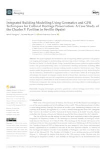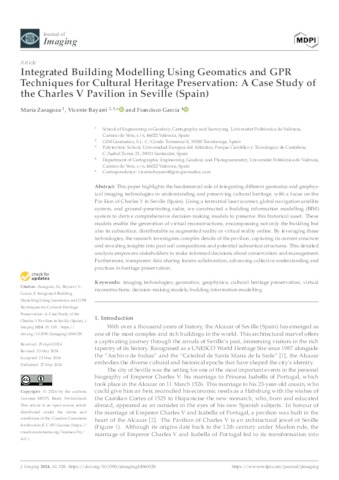 Zaragoza, María and Bayarri Cayón, Vicente and García, Francisco UNSPECIFIED, vicente.bayarri@uneatlantico.es, UNSPECIFIED (2024) Integrated Building Modelling Using Geomatics and GPR Techniques for Cultural Heritage Preservation: A Case Study of the Charles V Pavilion in Seville (Spain). Journal of Imaging, 10 (6). p. 128. ISSN 2313-433X