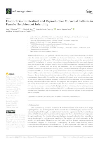 Marcos, Ana T. and Rus, Maria J. and Areal-Quecuty, Victoria and Simon-Soro, Aurea and Navarro-Pando, José Manuel UNSPECIFIED, UNSPECIFIED, UNSPECIFIED, UNSPECIFIED, jose.navarro@uneatlantico.es (2024) Distinct Gastrointestinal and Reproductive Microbial Patterns in Female Holobiont of Infertility. Microorganisms, 12 (5). p. 989. ISSN 2076-2607
