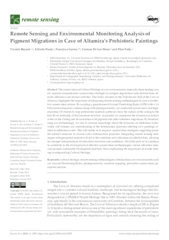 Bayarri Cayón, Vicente and Prada, Alfredo and García, Francisco and De Las Heras, Carmen and Fatás, Pilar vicente.bayarri@uneatlantico.es, UNSPECIFIED, UNSPECIFIED, UNSPECIFIED, UNSPECIFIED (2024) Remote Sensing and Environmental Monitoring Analysis of Pigment Migrations in Cave of Altamira’s Prehistoric Paintings. Remote Sensing, 16 (12). p. 2099. ISSN 2072-4292