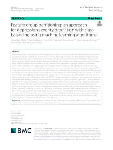 Shaha, Tumpa Rani and Begum, Momotaz and Uddin, Jia and Yélamos Torres, Vanessa and Alemany Iturriaga, Josep and Ashraf, Imran and Samad, Md. Abdus UNSPECIFIED, UNSPECIFIED, UNSPECIFIED, vanessa.yelamos@funiber.org, josep.alemany@uneatlantico.es, UNSPECIFIED, UNSPECIFIED (2024) Feature group partitioning: an approach for depression severity prediction with class balancing using machine learning algorithms. BMC Medical Research Methodology, 24 (1). ISSN 1471-2288