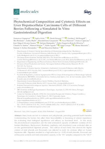 Giampieri, Francesca and Afrin, Sadia and Stewart, Derek and McDougall, Gordon and Brennan, Rex and Blyth, Lesley and Gasparrini, Massimiliano and Mazzoni, Luca and Capocasa, Franco and Alvarez-Suarez, José M. and Bompadre, Stefano and Nogueira Brás de Oliveira, Pedro and N. Santos, Claudia and Masias Vergara, Manuel and Agudo Toyos, Pablo and Crespo-Álvarez, Jorge and Mezzetti, Bruno and Forbes-Hernandez, Tamara Y. and Battino, Maurizio UNSPECIFIED, UNSPECIFIED, UNSPECIFIED, UNSPECIFIED, UNSPECIFIED, UNSPECIFIED, UNSPECIFIED, UNSPECIFIED, UNSPECIFIED, UNSPECIFIED, UNSPECIFIED, UNSPECIFIED, UNSPECIFIED, manuel.masias@uneatlantico.es, pablo.agudo@uneatlantico.es, jorge.crespo@uneatlantico.es, UNSPECIFIED, UNSPECIFIED, UNSPECIFIED (2018) Phytochemical Composition and Cytotoxic Effects on Liver Hepatocellular Carcinoma Cells of Different Berries Following a Simulated In Vitro Gastrointestinal Digestion. Molecules, 23 (8). p. 1918. ISSN 1420-3049