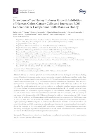 Afrin, Sadia and Forbes-Hernandez, Tamara Y. and Gasparrini, Massimiliano and Bompadre, Stefano and Quiles, José and Sanna, Gavino and Spano, Nadia and Giampieri, Francesca and Battino, Maurizio UNSPECIFIED, UNSPECIFIED, UNSPECIFIED, UNSPECIFIED, UNSPECIFIED, UNSPECIFIED, UNSPECIFIED, UNSPECIFIED, maurizio.battino@uneatlantico.es (2017) Strawberry-Tree Honey Induces Growth Inhibition of Human Colon Cancer Cells and Increases ROS Generation: A Comparison with Manuka Honey. International Journal of Molecular Sciences, 18 (3). p. 613. ISSN 1422-0067
