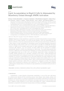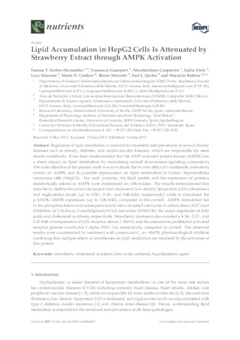Forbes-Hernandez, Tamara Y. and Giampieri, Francesca and Gasparrini, Massimiliano and Afrin, Sadia and Mazzoni, Luca and Cordero, Mario and Mezzetti, Bruno and Quiles, José L. and Battino, Maurizio tamara.forbes@unini.edu.mx, UNSPECIFIED, UNSPECIFIED, UNSPECIFIED, UNSPECIFIED, UNSPECIFIED, UNSPECIFIED, UNSPECIFIED, maurizio.battino@uneatlantico.es (2017) Lipid Accumulation in HepG2 Cells Is Attenuated by Strawberry Extract through AMPK Activation. Nutrients, 9 (6). p. 621. ISSN 2072-6643