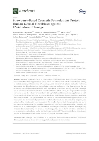 Gasparrini, Massimiliano and Forbes-Hernandez, Tamara Y. and Afrin, Sadia and Reboredo-Rodriguez, Patricia and Cianciosi, Danila and Mezzetti, Bruno and Quiles, José L. and Bompadre, Stefano and Battino, Maurizio and Giampieri, Francesca UNSPECIFIED, tamara.forbes@unini.edu.mx, UNSPECIFIED, UNSPECIFIED, UNSPECIFIED, UNSPECIFIED, UNSPECIFIED, UNSPECIFIED, maurizio.battino@uneatlantico.es, UNSPECIFIED (2017) Strawberry-Based Cosmetic Formulations Protect Human Dermal Fibroblasts against UVA-Induced Damage. Nutrients, 9 (6). p. 605. ISSN 2072-6643