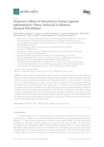 Gasparrini, Massimiliano and Forbes-Hernandez, Tamara Y. and Giampieri, Francesca and Afrin, Sadia and Mezzetti, Bruno and Quiles, José L. and Bompadre, Stefano and Battino, Maurizio UNSPECIFIED, tamara.forbes@unini.edu.mx, UNSPECIFIED, UNSPECIFIED, UNSPECIFIED, UNSPECIFIED, UNSPECIFIED, maurizio.battino@uneatlantico.es (2017) Protective Effect of Strawberry Extract against Inflammatory Stress Induced in Human Dermal Fibroblasts. Molecules, 22 (1). p. 164. ISSN 1420-3049