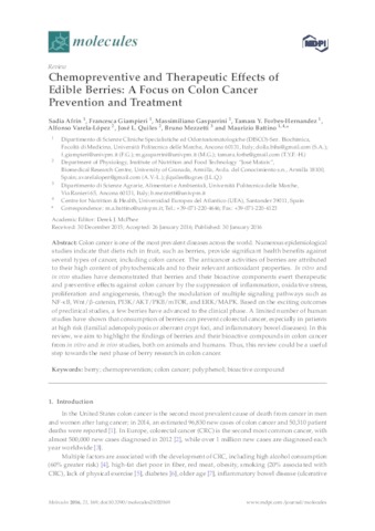Afrin, Sadia and Giampieri, Francesca and Gasparrini, Massimiliano and Forbes-Hernandez, Tamara and Varela-López, Alfonso and Quiles, José and Mezzetti, Bruno and Battino, Maurizio UNSPECIFIED, UNSPECIFIED, UNSPECIFIED, UNSPECIFIED, UNSPECIFIED, UNSPECIFIED, UNSPECIFIED, maurizio.battino@uneatlantico.es (2016) Chemopreventive and Therapeutic Effects of Edible Berries: A Focus on Colon Cancer Prevention and Treatment. Molecules, 21 (2). p. 169. ISSN 1420-3049