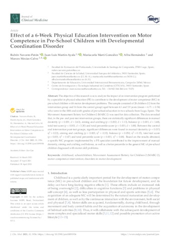 Navarro-Patón, Rubén and Martín-Ayala, Juan Luis and Martí González, Mariacarla and Hernández, Alba and Mecías-Calvo, Marcos UNSPECIFIED, juan.martin@uneatlantico.es, mariacarla.marti@uneatlantico.es, alba.hernandez@uneatlantico.es, marcos.mecias@uneatlantico.es (2021) Effect of a 6-Week Physical Education Intervention on Motor Competence in Pre-School Children with Developmental Coordination Disorder. Journal of Clinical Medicine, 10 (9). p. 1936. ISSN 2077-0383