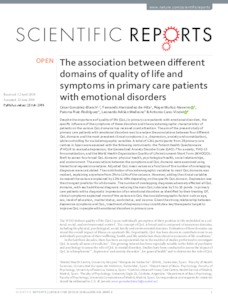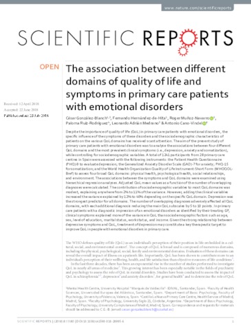 González-Blanch, César and Hernández-de-Hita, Fernando and Muñoz-Navarro, Roger and Ruíz-Rodríguez, Paloma and Medrano, Leonardo Adrián and Cano-Vindel, Antonio cesar.gonzalezblanch@uneatlantico.es, UNSPECIFIED, UNSPECIFIED, UNSPECIFIED, UNSPECIFIED, UNSPECIFIED (2018) The association between different domains of quality of life and symptoms in primary care patients with emotional disorders. Scientific Reports, 8 (11180). pp. 1-10. ISSN 2045-2322
