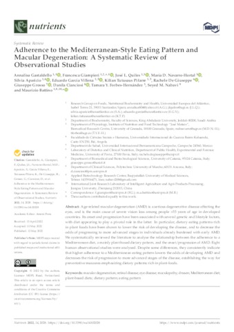 Gastaldello, Annalisa and Giampieri, Francesca and Quiles, José L. and Navarro-Hortal, María D. and Aparicio Obregón, Silvia and García Villena, Eduardo and Tutusaus, Kilian and De Giuseppe, Rachele and Grosso, Giuseppe and Cianciosi, Danila and Forbes-Hernández, Tamara Y. and Nabavi, Seyed M. and Battino, Maurizio UNSPECIFIED, francesca.giampieri@uneatlantico.es, jose.quiles@uneatlantico.es, UNSPECIFIED, silvia.aparicio@uneatlantico.es, eduardo.garcia@uneatlantico.es, kilian.tutusaus@uneatlantico.es, UNSPECIFIED, UNSPECIFIED, UNSPECIFIED, UNSPECIFIED, UNSPECIFIED, maurizio.battino@uneatlantico.es (2022) Adherence to the Mediterranean-Style Eating Pattern and Macular Degeneration: A Systematic Review of Observational Studies. Nutrients, 14 (10). p. 2028. ISSN 2072-6643