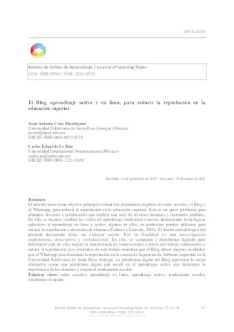 Mandujano, Juan Antonio Cruz and Uc-Rios, Carlos UNSPECIFIED, carlos.uc@unini.edu.mx (2021) El Blog, aprendizaje activo y en línea para reducir la reprobación en la Educación Superior. Revista de Estilos de Aprendizaje, 14 (27). pp. 62-78.
