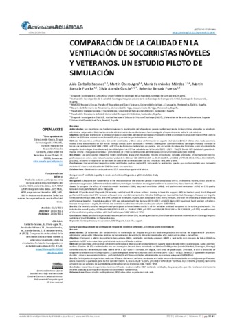 Aranda García, Silvia and Carballo Fazanes, Aida and Otero Agra, Martín and Fernández Méndez, María and Barcala Furelos, Martín and Barcala Furelos, Roberto UNSPECIFIED, UNSPECIFIED, UNSPECIFIED, UNSPECIFIED, martin.barcala@uneatlantico.es, UNSPECIFIED (2022) Comparación de la calidad en la ventilación de socorristas nóveles y veteranos. Un estudio piloto de simulación. Revista de Investigación en Actividades Acuáticas, 6 (11). pp. 37-43. ISSN 2530-805X