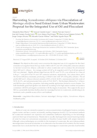 Ruiz-Marin, Alejandro and Canedo-Lopez, Yunuen and Narvaez-Garcia, Asteria and Zavala Loría, José del Carmen and Dzul Lopez, Luis Alonso and Sámano Celorio, María Luisa and Crespo-Álvarez, Jorge and García Villena, Eduardo and Agudo-Toyos, Pablo UNSPECIFIED, UNSPECIFIED, UNSPECIFIED, jose.zavala@unini.edu.mx, luis.dzul@unini.edu.mx, marialuisa.samano@uneatlantico.es, jorge.crespo@uneatlantico.es, eduardo.garcia@uneatlantico.es, pablo.agudo@uenatlantico.es (2019) Harvesting Scenedesmus obliquus via Flocculation of Moringa oleifera Seed Extract from Urban Wastewater: Proposal for the Integrated Use of Oil and Flocculant. Energies, 12 (20). p. 3996. ISSN 1996-1073