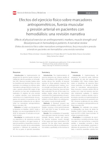 Pérez-Jiménez, Ana Karen and Chávez-Becerril, Graciela Berenice and Orozco González, Nelly and Camacho-López, Saby UNSPECIFIED, UNSPECIFIED, nelly.orozco@unini.edu.mx, UNSPECIFIED (2021) Efectos del ejercicio físico sobre marcadores antropométricos, fuerza muscular y presión arterial en pacientes con hemodiálisis: una revisión narrativa. Revista de Nutrición Clínica y Metabolismo, 4 (4). pp. 98-115. ISSN 2619564X