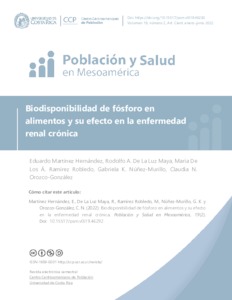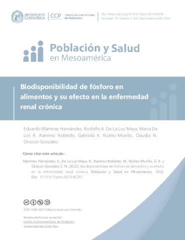 Martínez Hernández, Eduardo and De La Luz Maya, Rodolfo A. and Ramírez Robledo, María De Los Á and Núñez-Murillo, Gabriela K. and Orozco González, Nelly UNSPECIFIED, UNSPECIFIED, UNSPECIFIED, UNSPECIFIED, nelly.orozco@unini.edu.mx (2022) Biodisponibilidad de fósforo en alimentos y su efecto en la enfermedad renal crónica. Población y Salud en Mesoamérica, 19 (2). pp. 293-320.