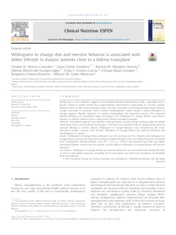 Orozco González, Nelly and Cortés-Sanabria, Laura and Márquez-Herrera, Roxana M. and Martín-del-Campo-López, Fabiola and Gómez-García, Erika F. and Rojas-Campos, Enrique and Gómez-Navarro, Benjamín and Cueto-Manzano, Alfonso M. nelly.orozco@unini.edu.mx, UNSPECIFIED, UNSPECIFIED, UNSPECIFIED, UNSPECIFIED, UNSPECIFIED, UNSPECIFIED, UNSPECIFIED (2022) Willingness to change diet and exercise behavior is associated with better lifestyle in dialysis patients close to a kidney transplant. Clinical Nutrition ESPEN, 47. pp. 277-282. ISSN 24054577