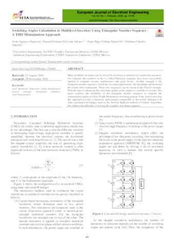 Aguayo-Alquicira, Jesus and De León Aldaco, Susana Estefany and Calleja-Gjumlich, Jorge Hugo and Claudio-Sánchez, Abraham UNSPECIFIED (2020) Switching Angles Calculation in Multilevel Inverters Using Triangular Number Sequence –A THD Minimization Approach. European Journal of Electrical Engineering, 22 (1). pp. 49-55. ISSN 21033641