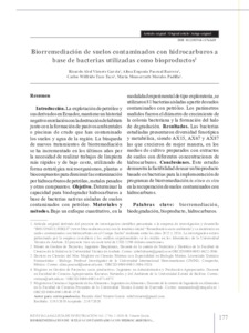 Introducción. La explotación de petróleo y sus derivados en Ecuador, mantiene un historial negativo en relación con la destrucción de hábitats junto con la formación de pasivos ambientales o piscinas de crudo que han contaminado los suelos y agua de la región. La búsqueda de nuevos tratamientos de biorremediación se ha incrementado en los últimos años por la necesidad de realizar trabajos de limpieza más rápidos y de bajo costo, utilizando de forma estratégica microorganismos, plantas o biocompuestos para disminuir la contaminación por hidrocarburos de petróleo, metales pesados y otros compuestos. Objetivo. Determinar la capacidad para biodegradar hidrocarburos a base de bacterias nativas aisladas de suelos contaminados con petróleo. Materiales y métodos. Bajo un enfoque cuantitativo, en la modalidad experimental de tipo exploratoria, se utilizaron 81 bacterias aisladas a partir de suelos contaminados con petróleo. Los parámetros medidos fueron el diámetro de crecimiento de la colonia bacteriana y la formación del halo de degradación. Resultados. Las bacterias estudiadas presentaron diversidad fenotípica y metabólica, siendo AX15, AX67 y AX87 las que crecieron de mejor manera, en los medios de cultivo preparados con extractos de suelos con diferentes concentraciones de hidrocarburos. Conclusiones. Este estudio demuestra la factibilidad de usar un bioproducto basado en bacterias para la implementación de programas de biorremediación in situ o ex situ en la recuperación de suelos contaminados con hidrocarburos.