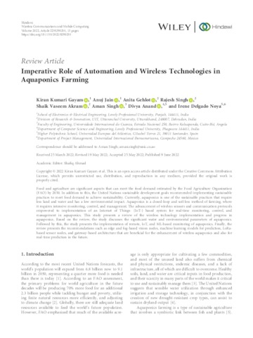 Gayam, Kiran Kumari and Jain, Anuj and Gehlot, Anita and Singh, Rajesh and Akram, Shaik Vaseem and Singh, Aman and Anand, Divya and Delgado Noya, Irene and Ahmad, Shafiq UNSPECIFIED, UNSPECIFIED, UNSPECIFIED, UNSPECIFIED, UNSPECIFIED, aman.singh@unic.co.ao, divya.anand@uneatlantico.es, irene.delgado@uneatlantico.es, UNSPECIFIED (2022) Imperative Role of Automation and Wireless Technologies in Aquaponics Farming. Wireless Communications and Mobile Computing, 2022. pp. 1-13. ISSN 1530-8669