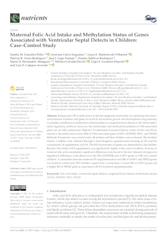 González-Peña, Sandra M. and Calvo-Anguiano, Geovana and Martínez-de-Villarreal, Laura E. and Ancer-Rodríguez, Patricia R. and Lugo-Trampe, José J. and Saldivar-Rodríguez, Donato and Hernández-Almaguer, María D. and Calzada-Dávila, Melissa and Guerrero-Orjuela, Ligia S. and Campos-Acevedo, Luis D. UNSPECIFIED (2021) Maternal Folic Acid Intake and Methylation Status of Genes Associated with Ventricular Septal Defects in Children: Case–Control Study. Nutrients, 13 (6). p. 2071. ISSN 2072-6643