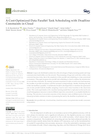 Rajalakshmi, N. R. and Dumka, Ankur and Kumar, Manoj and Singh, Rajesh and Gehlot, Anita and Akram, Shaik Vaseem and Anand, Divya and Elkamchouchi, Dalia H. and Delgado Noya, Irene UNSPECIFIED, UNSPECIFIED, UNSPECIFIED, UNSPECIFIED, UNSPECIFIED, UNSPECIFIED, divya.anand@uneatlantico.es, UNSPECIFIED, irene.delgado@uneatlantico.es (2022) A Cost-Optimized Data Parallel Task Scheduling with Deadline Constraints in Cloud. Electronics, 11 (13). p. 2022. ISSN 2079-9292