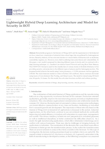 Anand, Ankita and Rani, Shalli and Singh, Aman and Elkamchouchi, Dalia H. and Delgado Noya, Irene UNSPECIFIED, UNSPECIFIED, aman.singh@uneatlantico.es, UNSPECIFIED, irene.delgado@uneatlantico.es (2022) Lightweight Hybrid Deep Learning Architecture and Model for Security in IIOT. Applied Sciences, 12 (13). p. 6442. ISSN 2076-3417