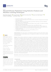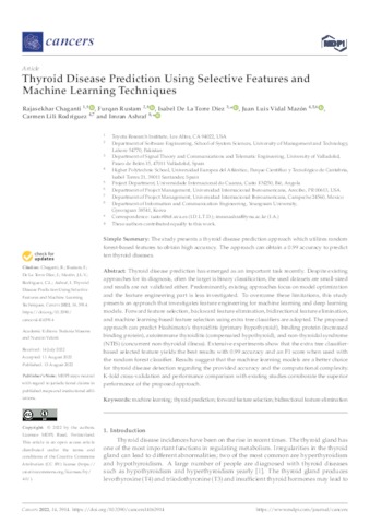 Chaganti, Rajasekhar and Rustam, Furqan and De La Torre Díez, Isabel and Vidal Mazón, Juan Luis and Rodríguez Velasco, Carmen Lilí and Ashraf, Imran UNSPECIFIED, UNSPECIFIED, UNSPECIFIED, juanluis.vidal@uneatlantico.es, carmen.rodriguez@uneatlantico.es, UNSPECIFIED (2022) Thyroid Disease Prediction Using Selective Features and Machine Learning Techniques. Cancers, 14 (16). p. 3914. ISSN 2072-6694