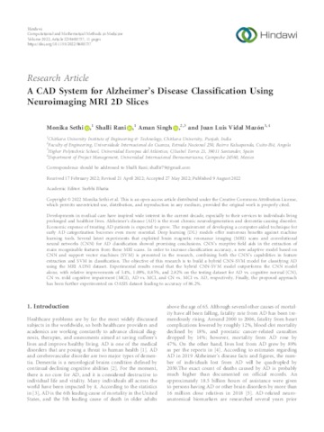 Sethi, Monika and Rani, Shalli and Singh, Aman and Vidal Mazón, Juan Luis and Bhatia, Surbhi UNSPECIFIED, UNSPECIFIED, aman.singh@uneatlantico.es, juanluis.vidal@uneatlantico.es, UNSPECIFIED (2022) A CAD System for Alzheimer’s Disease Classification Using Neuroimaging MRI 2D Slices. Computational and Mathematical Methods in Medicine, 2022. pp. 1-11. ISSN 1748-670X