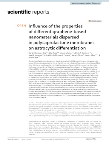 Mantecón-Oria, Marián and Tapia Martínez, Olga and Lafarga, Miguel and Berciano, María T. and Munuera, Jose M. and Villar-Rodil, Silvia and Paredes, Juan I. and Rivero, María J. and Diban, Nazely and Urtiaga, Ane UNSPECIFIED, olga.tapia@uneatlantico.es, UNSPECIFIED, UNSPECIFIED, UNSPECIFIED, UNSPECIFIED, UNSPECIFIED, UNSPECIFIED, UNSPECIFIED, UNSPECIFIED (2022) Influence of the properties of different graphene-based nanomaterials dispersed in polycaprolactone membranes on astrocytic differentiation. Scientific Reports, 12 (1). ISSN 2045-2322