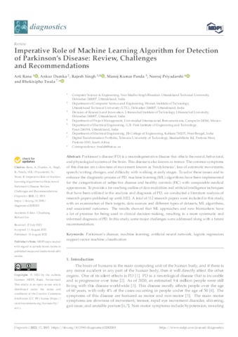 Rana, Arti and Dumka, Ankur and Singh, Rajesh and Panda, Manoj Kumar and Priyadarshi, Neeraj and Twala, Bhekisipho UNSPECIFIED (2022) Imperative Role of Machine Learning Algorithm for Detection of Parkinson’s Disease: Review, Challenges and Recommendations. Diagnostics, 12 (8). p. 2003. ISSN 2075-4418