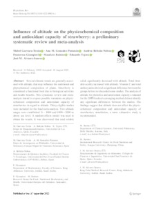 Several climatic trends are generally associated with altitude, that may influence the nutritional and phytochemical composition of plants. Strawberry is considered a functional food due to biological activities and health benefits. This systematic review and meta-analysis intend to expose possible variations on physicochemical composition and antioxidant capacity of strawberries in regard to altitude. Thirty eligible studies were included for the final meta-analysis. Two altitude ranges were established: 0 – 1000 and 1000—2000 m above sea level. A random-effects model was used to obtain the results. It was discovered that total soluble solids significantly decreased with altitude. Total titratable acidity increased with altitude. Vitamin C and total anthocyanins showed a significant difference between the groups before we discarded some studies. The analysis of altitude for phenolics and antioxidant capacity evaluated for the DPPH radical scavenging method did not identify any significant differences between the studies. The findings suggest that altitude does not affect the physicochemical composition and antioxidant capacity of strawberries; nonetheless, a more exhaustive study is recommended.