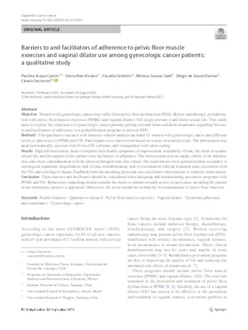 Araya, Paulina and Roa-Alcaino, Sonia and Celedón, Claudia and Cuevas-Said, Mónica and de Sousa Dantas, Diego and Sacomori, Cinara UNSPECIFIED, UNSPECIFIED, UNSPECIFIED, UNSPECIFIED, UNSPECIFIED, csacomori@yahoo.com.br (2022) Barriers to and facilitators of adherence to pelvic floor muscle exercises and vaginal dilator use among gynecologic cancer patients: a qualitative study. Supportive Care in Cancer. ISSN 0941-4355