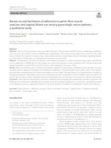 Objective: Women with gynecologic cancer may sufer from pelvic foor dysfunction (PFD). Before radiotherapy, prehabilitation with pelvic foor muscle exercises (PFME) and vaginal dilator (VD) might prevent it and foster sexual life. This study aims to explore the experience of gynecologic cancer patients getting external beam radiation treatments regarding barriers to and facilitators of adherence to a prehabilitation program to prevent PFD. Methods: This qualitative research with thematic content analysis included 11 women with gynecologic cancer and diferent levels of adherence to PFME and VD. Participants were interviewed based on a semi-structured script. The information was analyzed manually, assisted with Nvivo12® software, and triangulated with open coding. Results: High self-motivation, desire to improve their health, symptoms of improvement, availability of time, the desire to resume sexual life, and the support of the partner were facilitators of adherence. The instructional exercise audio, clarity of the information, and closer communication with the physical therapist were also valued. The main barriers were general malaise secondary to oncological treatments, forgetfulness, lack of time, misinformation, lack of coordination with the treatment team, discomfort with the VD, and a feeling of shame. Feedback from the attending physician was a facilitator when present or a barrier when absent. Conclusion: These barriers and facilitators should be considered when designing and implementing preventive programs with PFME and VD. Behavioral counselling should consider the desire to remain sexually active; in such cases, including the partner in the therapeutic process is appraised. Otherwise, the focus should be on benefts for maintenance of pelvic foor function.