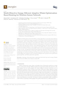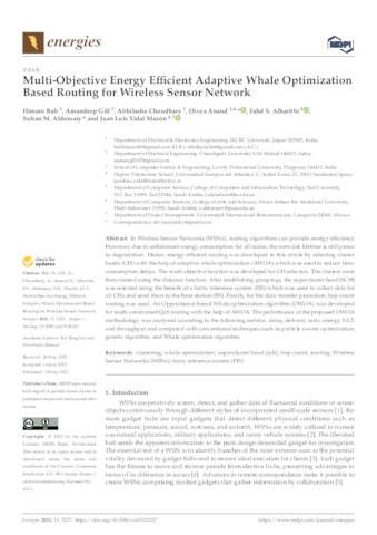 Bali, Himani and Gill, Amandeep and Choudhary, Abhilasha and Anand, Divya and Alharithi, Fahd S. and Aldossary, Sultan M. and Vidal Mazón, Juan Luis UNSPECIFIED, UNSPECIFIED, UNSPECIFIED, divya.anand@uneatlantico.es, UNSPECIFIED, UNSPECIFIED, juanluis.vidal@uneatlantico.es (2022) Multi-Objective Energy Efficient Adaptive Whale Optimization Based Routing for Wireless Sensor Network. Energies, 15 (14). p. 5237. ISSN 1996-1073