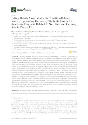 Rivera Medina, Christian and Briones Urbano, Mercedes and de Jesús Espinosa, Aixa and Toledo López, Ángel UNSPECIFIED, mercedes.briones@uneatlantico.es, UNSPECIFIED, UNSPECIFIED (2020) Eating Habits Associated with Nutrition-Related Knowledge among University Students Enrolled in Academic Programs Related to Nutrition and Culinary Arts in Puerto Rico. Nutrients, 12 (5). p. 1408. ISSN 2072-6643